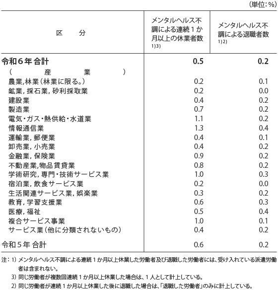 厚生労働省が行っている令和6年「労働安全衛生調査(実態調査)」によると、情報通信業は、「過去1年間にメンタルヘルス不調により連続1か月以上休業又は退職した労働者割合」が他の業種と比較し、高い割合となっています。